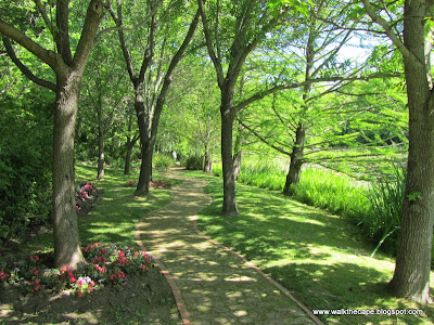We walked up a path next to a little stream. I don't remember this area from my previous visit. We crossed a sweet little bridge, and noted the newly planted beds under the trees.